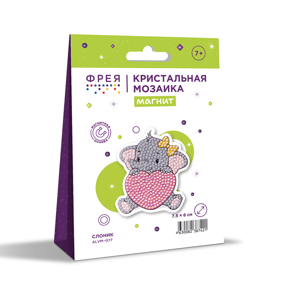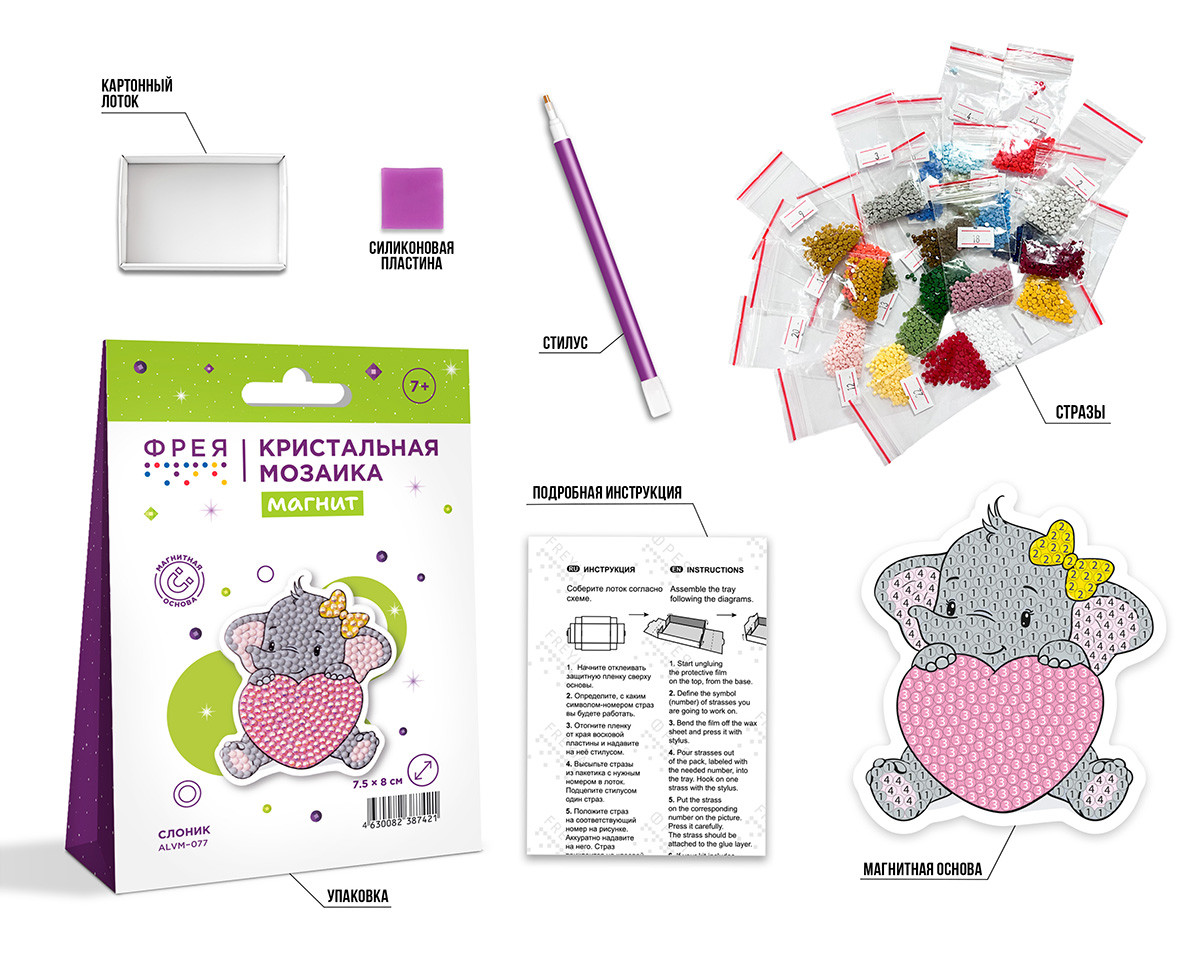 Набор для создания магнита в технике " Кристальная/ алмазная мозаика". Выполнение работы не требует специальных навыков, выкладывать магнит очень легко и быстро. Стразы наклеиваются поверх изображения со схемой на уже нанесенный клеевой слой. Увлекательный процесс создания поможет развить мелкую моторику и повысить концентрацию внимания. Готовое изделие станет ярким и оригинальным украшением вашего дома! В набор ТМ ФРЕЯ " Кристальная мозаика" входит:- магнитная основа с клеевым слоем и защитной плёнкой,- стилус и восковая подушечка,- круглые стразы: 4 цвета, с запасом более 30%,- картонный лоток,- инструкция. Тип выкладки: частичнаяУровень сложности: 1 из 3Размер готового изделия: 7 х 8, 5 смРазмер упаковки: 10. 5х2. 5х14. 5 см. Набор сертифицирован для детского творчества. Сообщить о неточности в описании