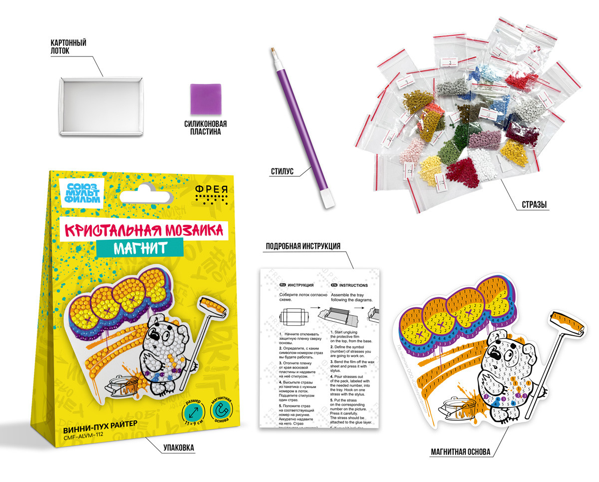 Добро пожаловать в мир волшебства и ностальгии с коллекцией наборов в технике " Кристальная мозаика", созданных по анимационным шедеврам студии " Союзмультфильм". Миллионы людей выросли на захватывающих приключениях любимых героев. Эти персонажи стали частью вашего детства, а теперь они могут украсить вашу повседневную жизнь. Набор, сертифицированный для детского творчества, для создания яркого магнита. Рекомендованный возраст: 7+. Выполнение работы не требует специальных навыков, выкладывать изображение очень просто и легко. Стразы наклеиваются поверх изображения со схемой на уже нанесенный клеевой слой. Набор ТМ ФРЕЯ комплектуется всеми необходимыми материалами: - магнитная основа с клеевым слоем и защитной плёнкой, - круглые стразы: 5 цветов, с запасом более 30%,,- картонный лоток, - стилус и восковая подушечка,- инструкция. Тип выкладки: частичнаяУровень сложности: 1 из 3Размер готового изделия: 11 х 9 смРазмер упаковки: 10. 5х2. 5х14. 5 см. Продукция соответствует требованиям ТР ТС " О безопасности игрушек". Сообщить о неточности в описании