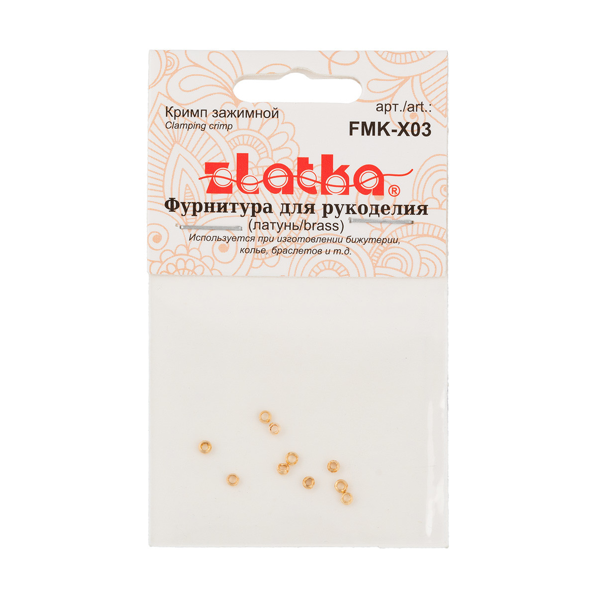 Кримп зажимной " Zlatka" FMK- X03 - это вспомогательный элемент фурнитуры, с помощью которого можно маскировать узелки на леске, ювелирном тросике, фиксировать бусины, если невозможно создать узел на леске или ювелирном тросике, кримп используют для закрепления. Также кримпы используются просто в качестве маленьких бусин. Размер: 2 х 1. 5 мм. Количество в упаковке: 10 шт. Материал: латунь. Сообщить о неточности в описании